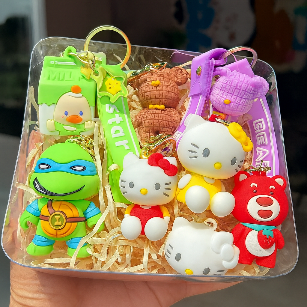 Bring cuteness everywhere with this adorable keychain hamper set featuring 5 must-have designs: a Hello Kitty keychain, Ninja Turtle keychain, duck milk carton keychain, pink teddy bear keychain, and a cute bear design keychain. Perfect for gifting, collecting, or decorating bags, purses, and backpacks, this kawaii keychain set makes an ideal present for girls, friends, and cartoon lovers. High-quality, durable, and super stylish – these cartoon character keychains add fun to everyday accessories.