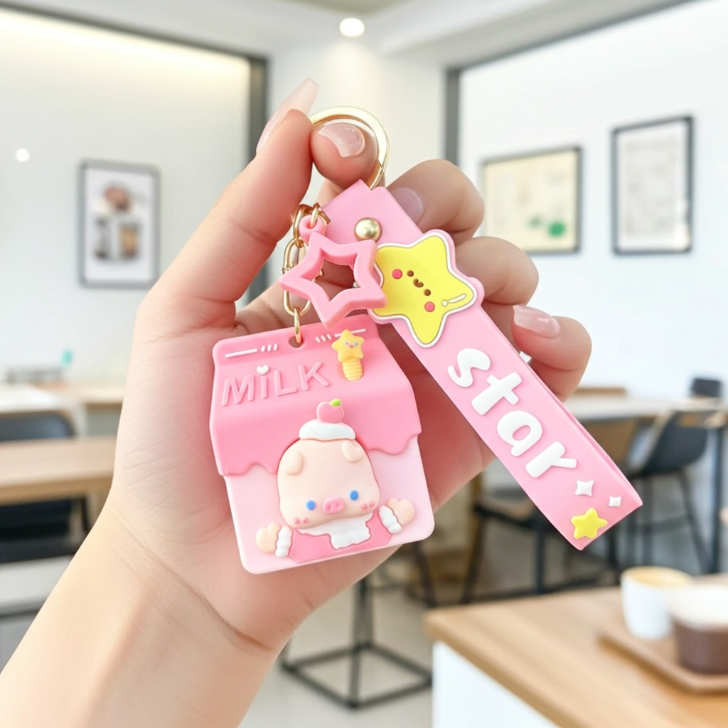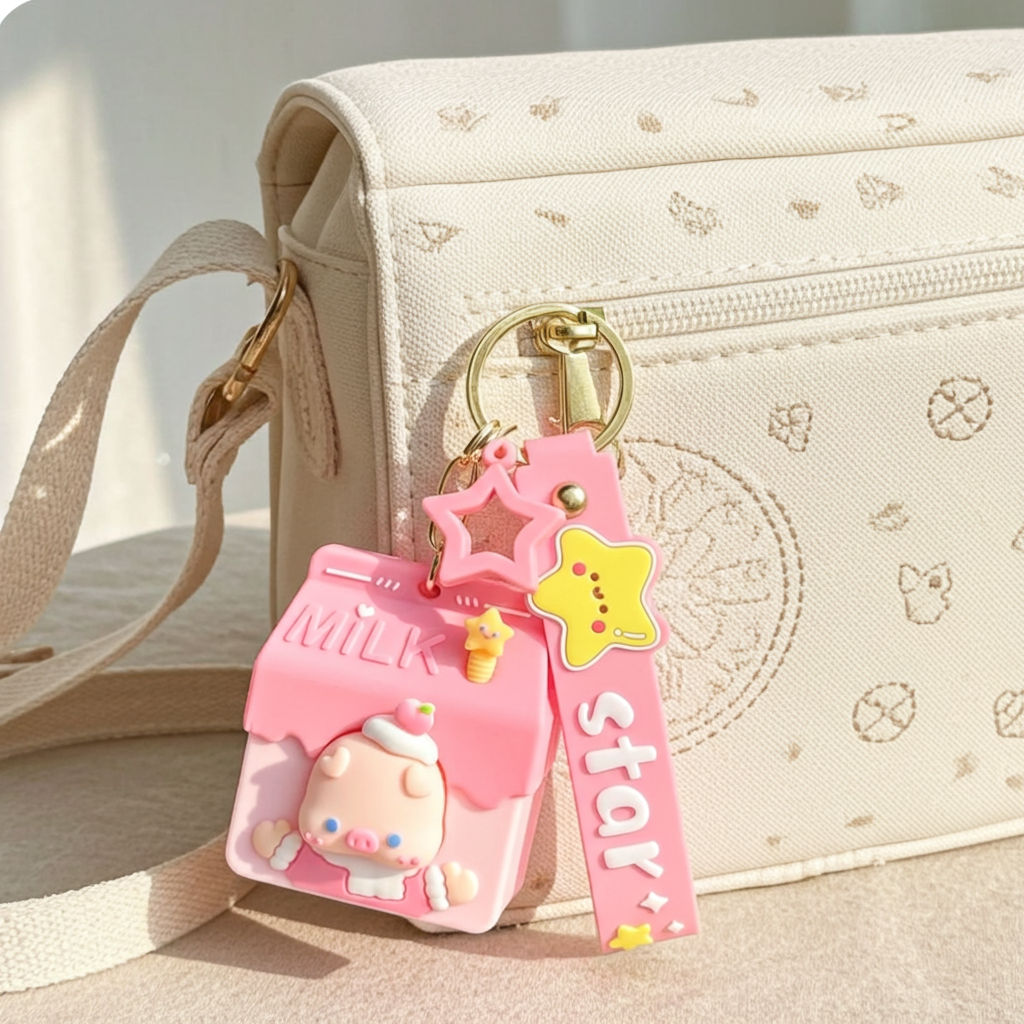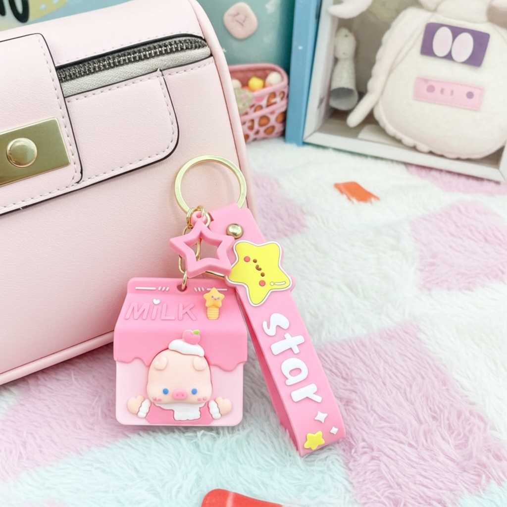 Cute Pink Milk Carton Pig Keychain with Star Strap