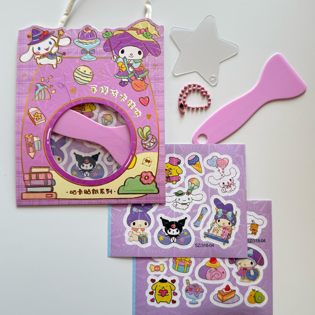 Each pack includes acrylic keychain parts, stickers & chain