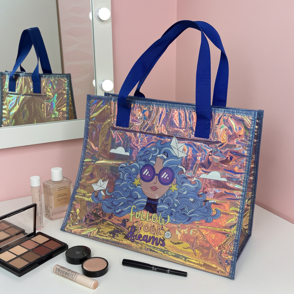 Whether you’re heading to work, school, the beach, or a shopping spree, this holographic tote combines functionality with fashion to keep you organized and stylish.