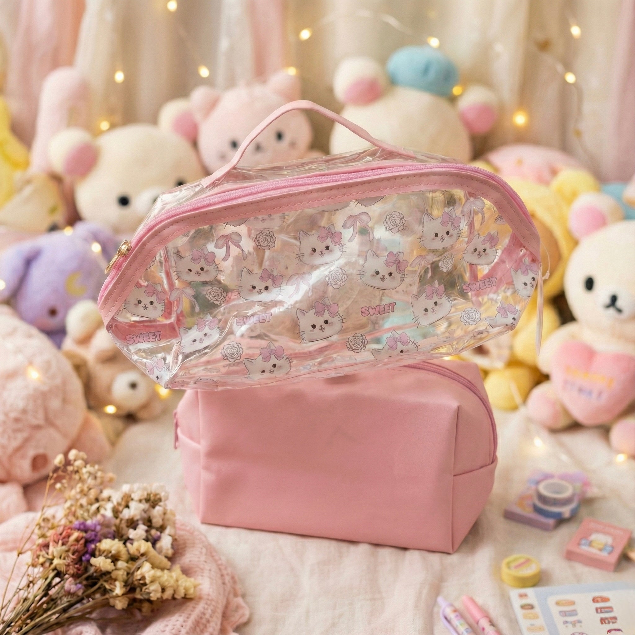 • Dual pouch combo – one clear cute pouch + one solid pink pouch