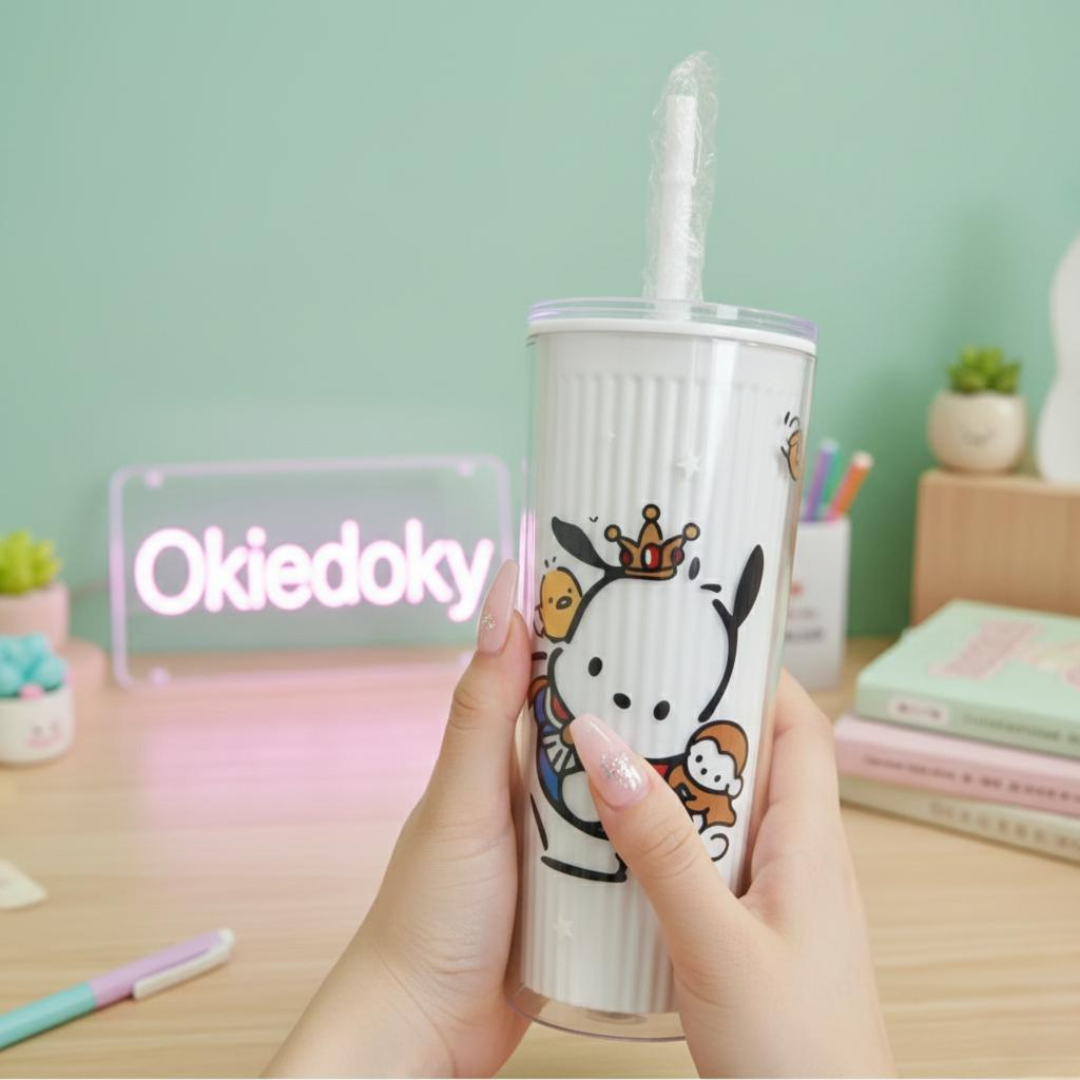 Stay cute and refreshed with this Pochacco Kawaii Tumbler, featuring the beloved Sanrio character Pochacco wearing a royal crown alongside his adorable friends. This aesthetic tumbler is perfect for sipping your favorite milk, iced coffee, smoothies, or bubble tea—all while showing off your love for cute cartoon drinkware.