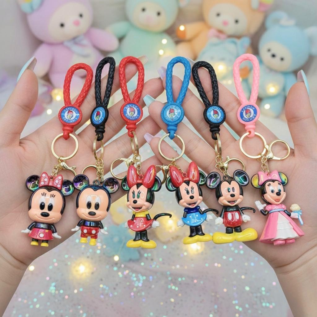Each figure is a small, durable PVC charm displaying Mickey or Minnie in various outfits—from classic red and yellow to unique, metallic-finish designs and a beautiful pink princess dress for Minnie. The keychains are attached to a sturdy metal ring and a stylish, braided wrist strap (available in red, black, pink, and blue), making them easy to hold, find in a bag, or wear on your wrist.