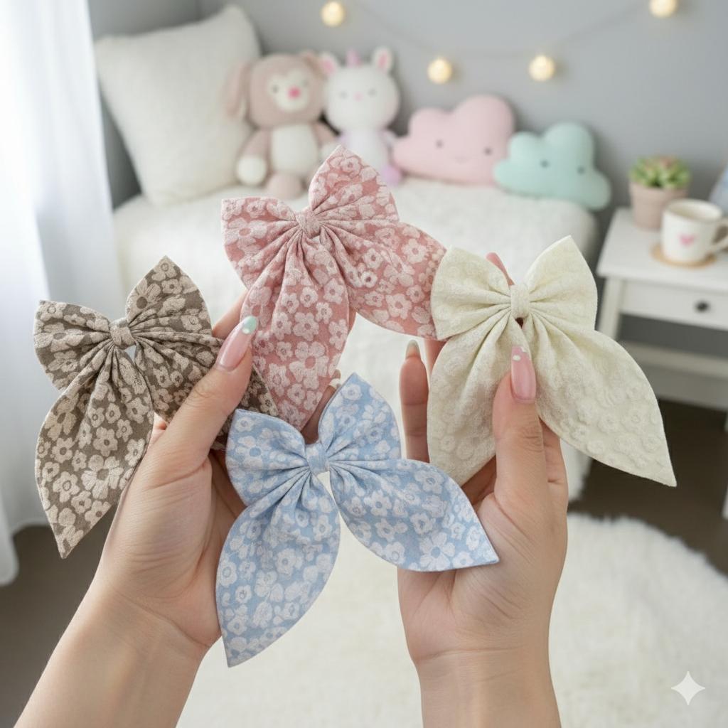 Design: These bows often feature delicate chiffon or embroidered fabric adorned with a soft floral print or meticulously crafted three-dimensional flowers.