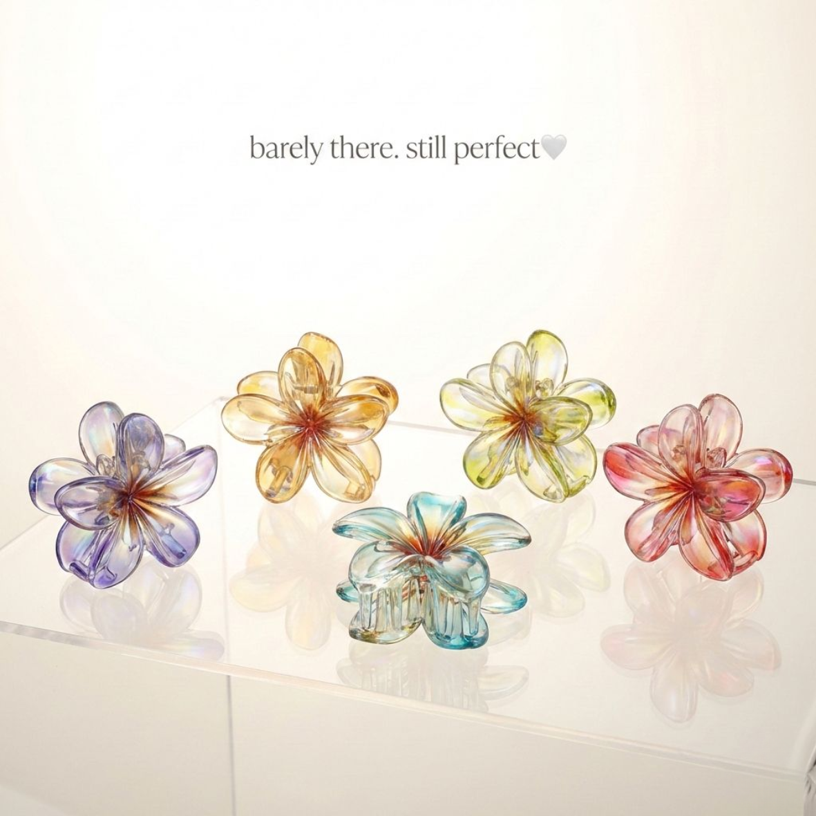 Designed in a delicate flower shape with a clear jelly finish, this clip gives off light, fresh, and playful vibes 🌸✨ Its translucent look makes it perfect for matching with any outfit β€” from casual to dressy πŸ’«