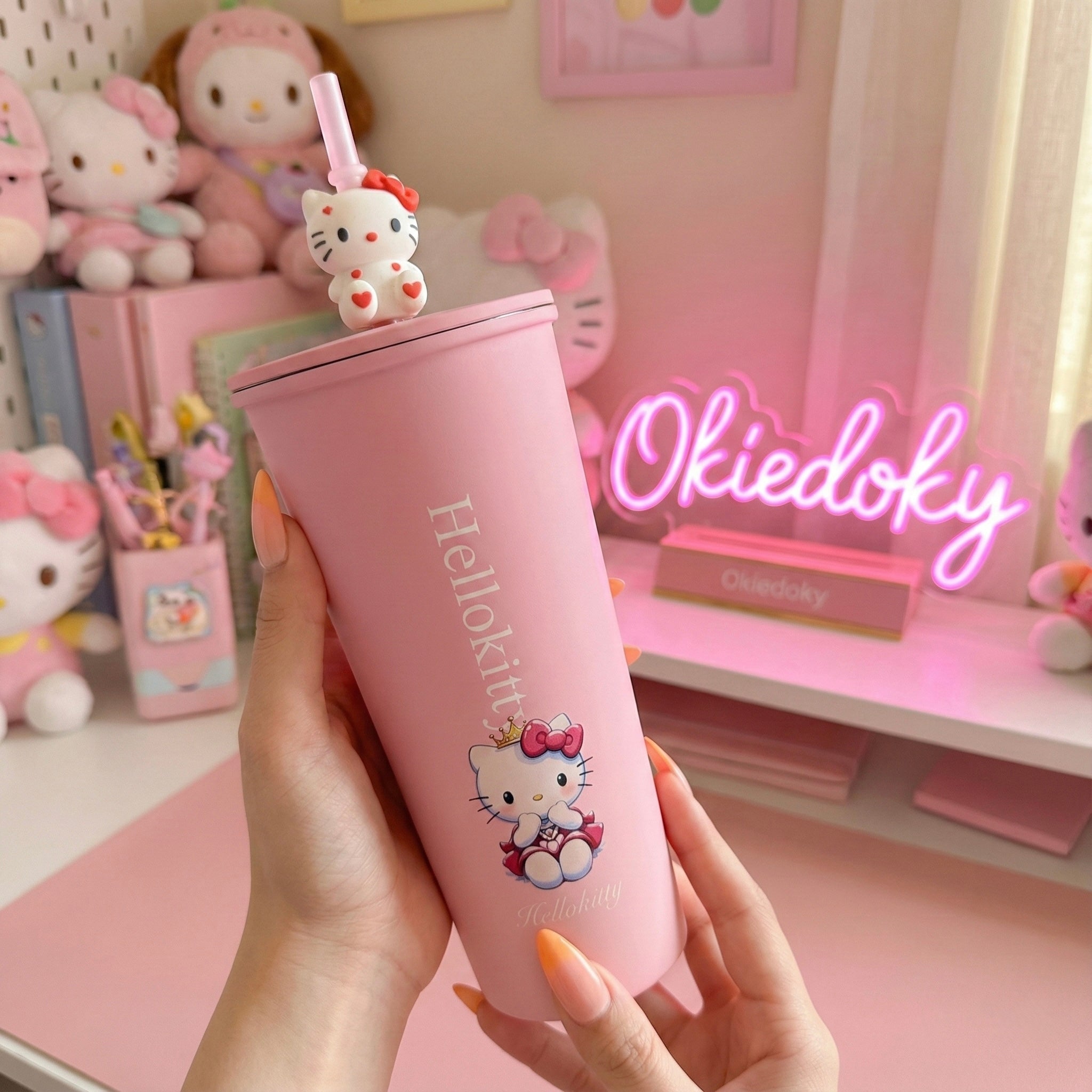 This Hello Kitty Pink Tumbler is the perfect mix of kawaii aesthetics and everyday functionality. Designed in a soft pastel pink shade with an adorable Hello Kitty print and a cute straw topper, this tumbler is ideal for water, juice, iced coffee, or smoothies.