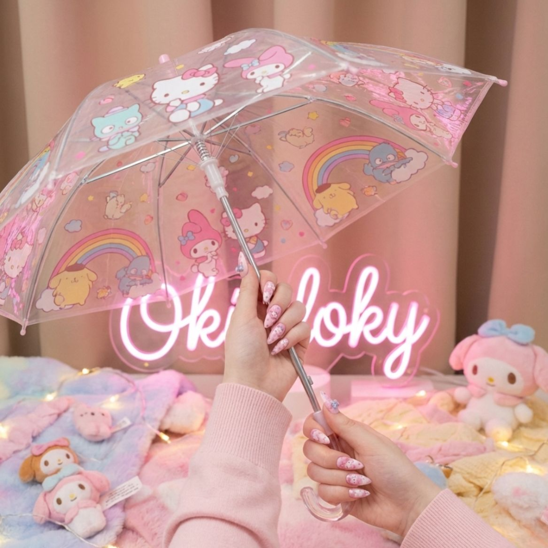 This Sanrio Transparent Umbrella features adorable Sanrio characters in a pastel, kawaii all-over print with rainbows, stars, and playful details. The clear canopy gives excellent visibility while keeping you protected from rain β€” practical and aesthetic.