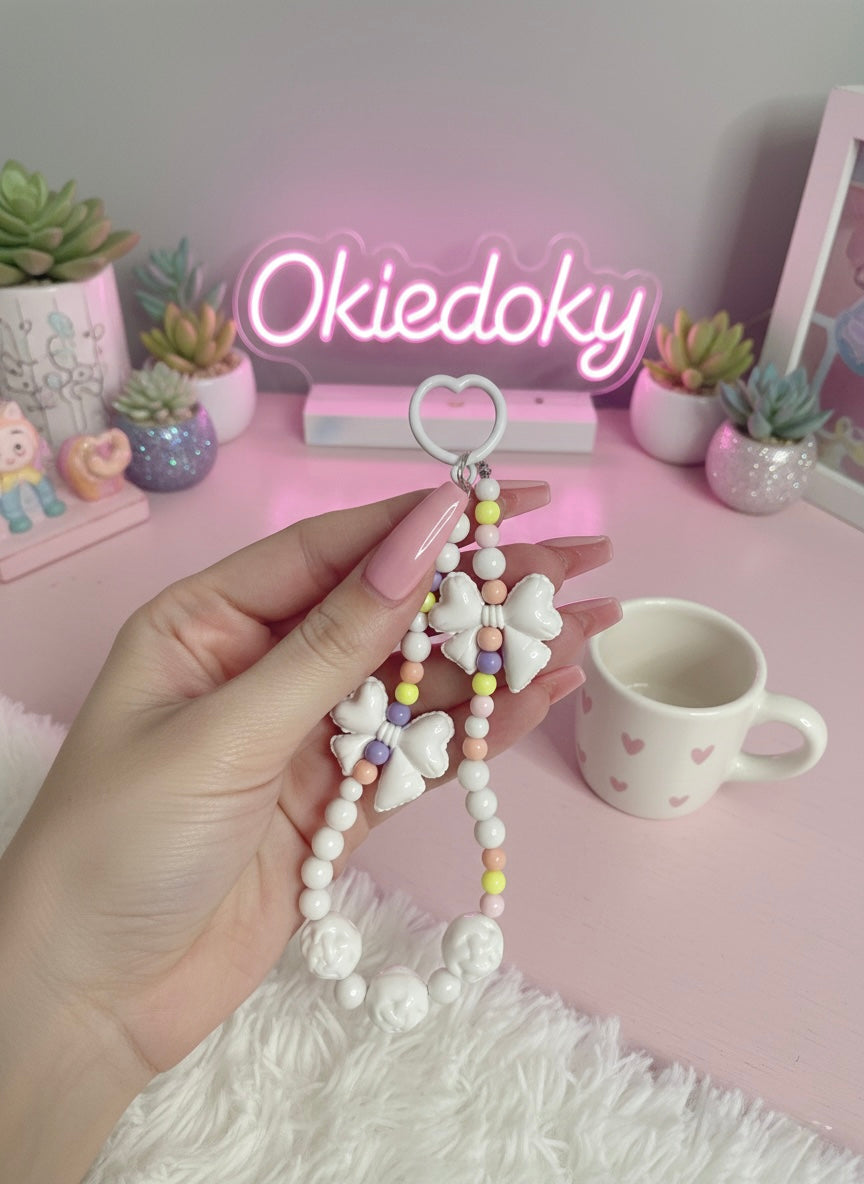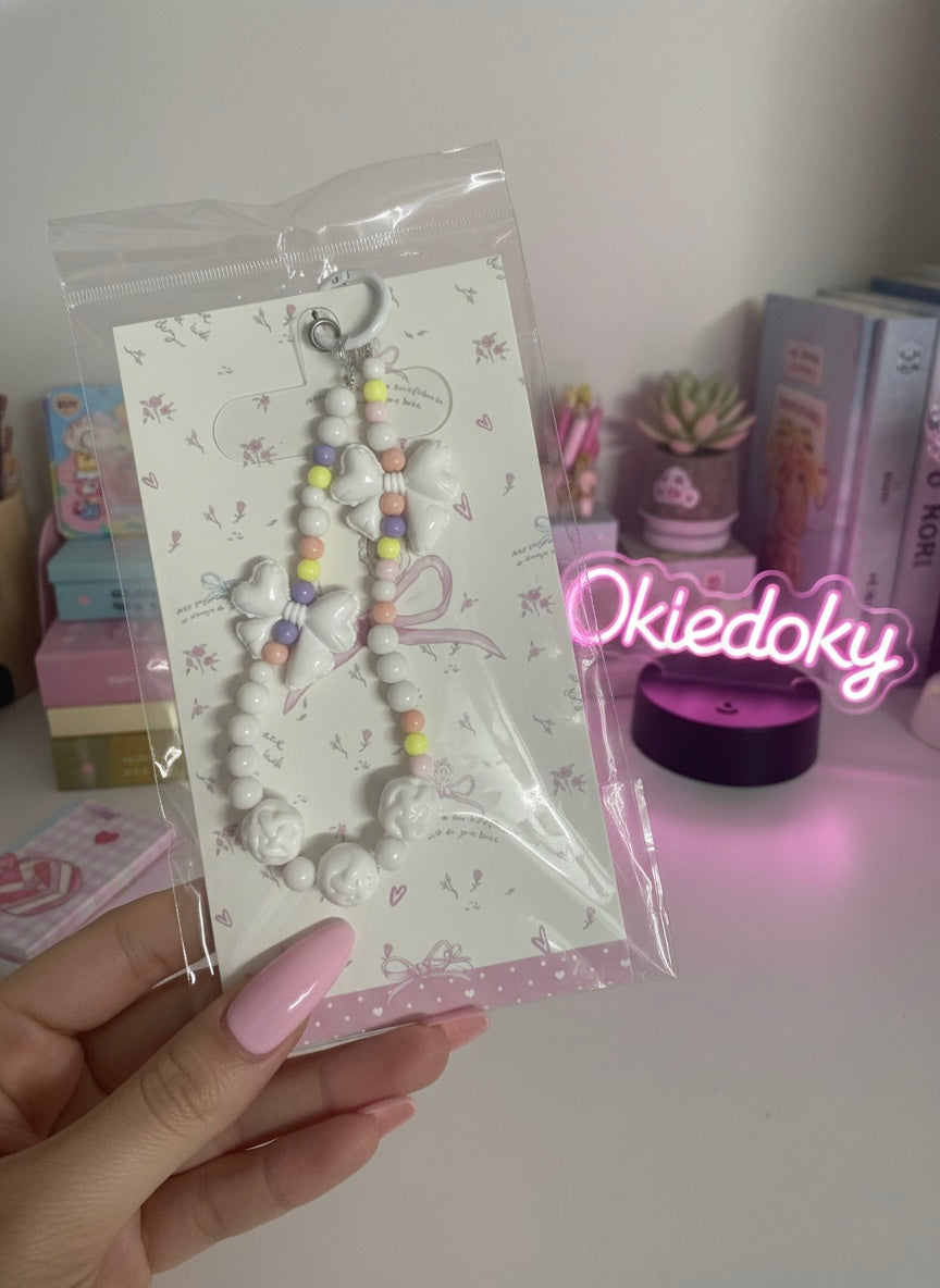 Featuring adorable bow charms, glossy white beads, and subtle pastel accents, this charm adds an elegant yet cute touch to your phone or accessories.
