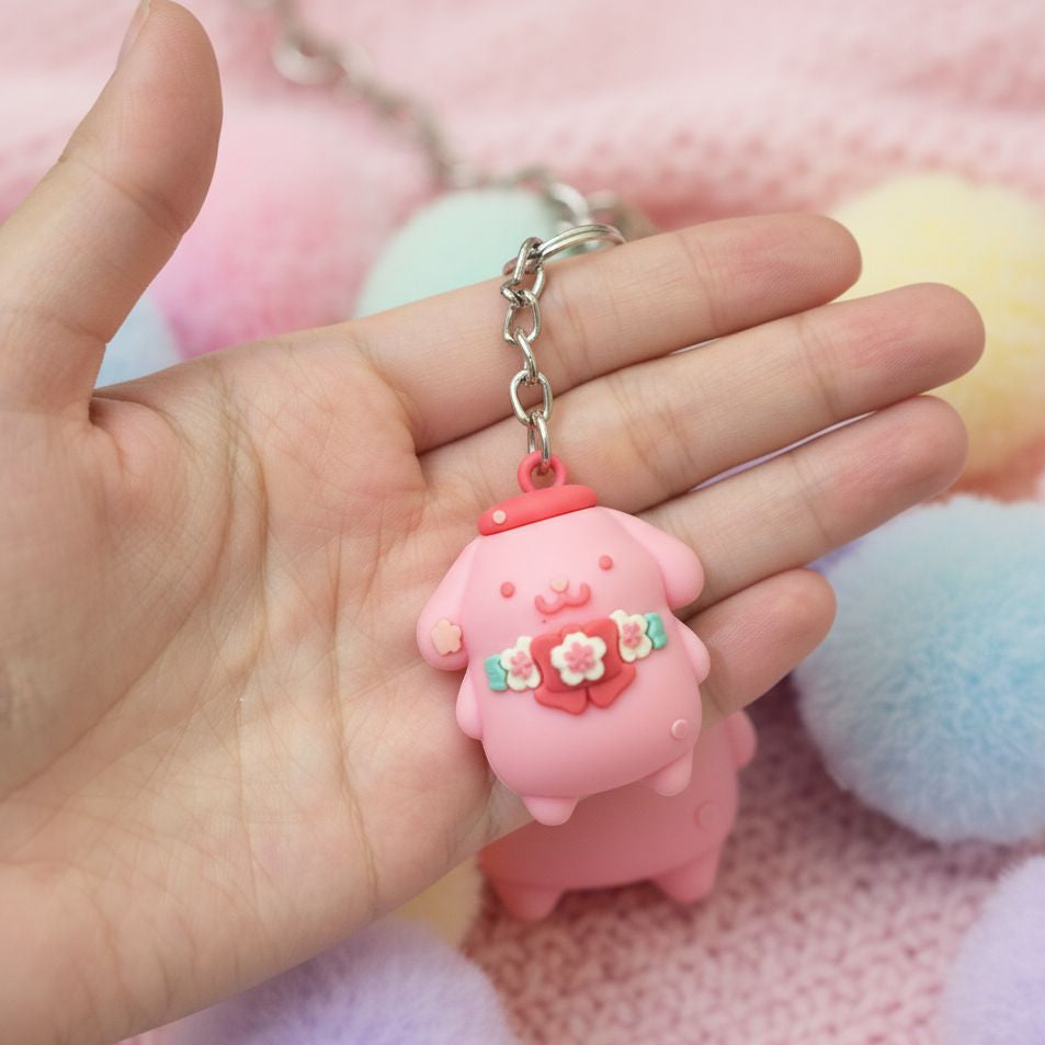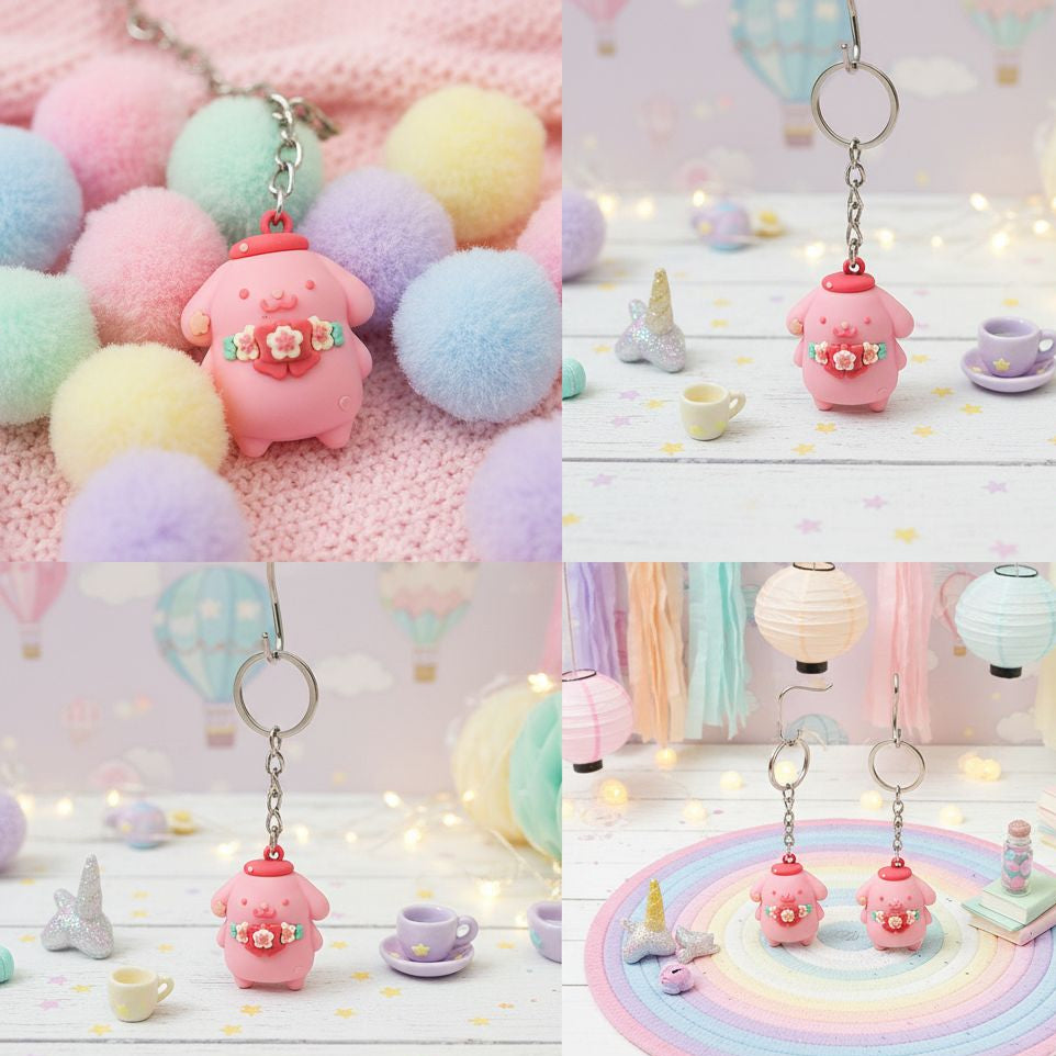 Grab this adorable Pompompurin-inspired keychain in a charming pink colorway! This unique version features the beloved character style adorned with a pink floral belt and red hat.