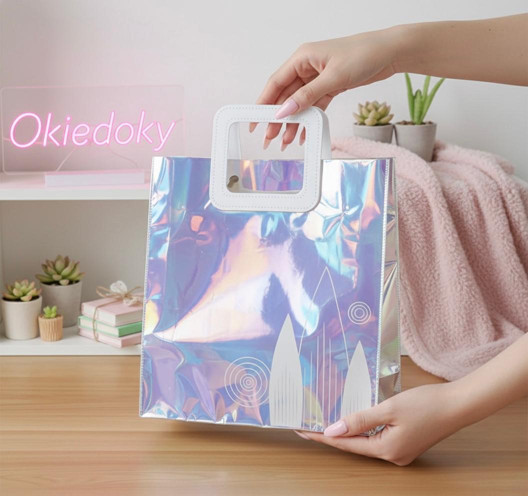 This eco-friendly reusable bag can hold small to medium-sized gifts, candy, cosmetics, stationery, or party favors. Add sparkle and elegance to your celebrations with this holographic gift bag that doubles as a stylish keepsake.