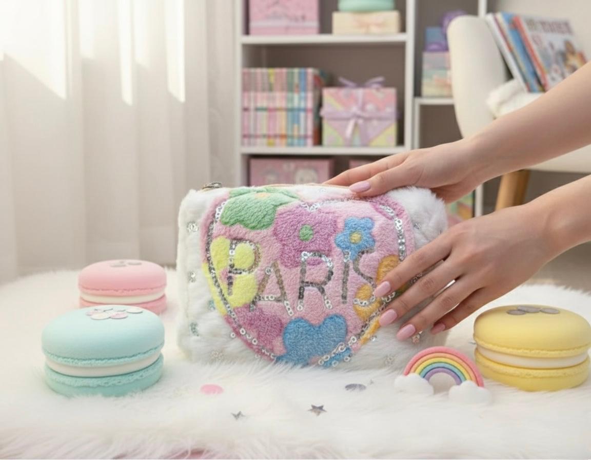 Designed in cozy white fur and decorated with a rainbow pastel “PARIS” embroidery, it sparkles with sequins and gives total kawaii aesthetic goals. Perfect for storing your makeup, accessories, or tiny essentials — it’s both cute and functional!