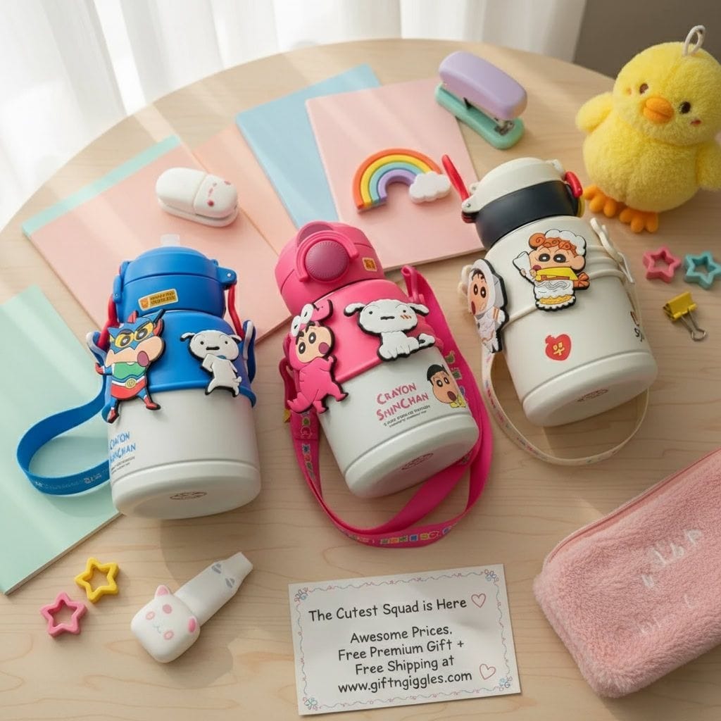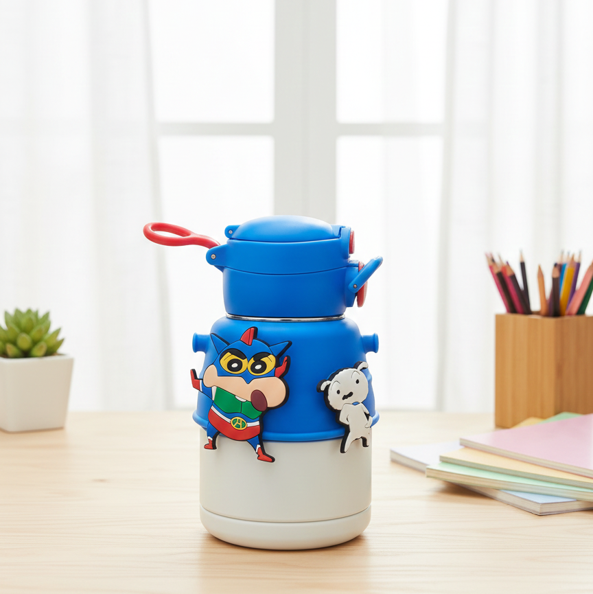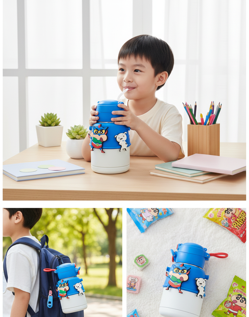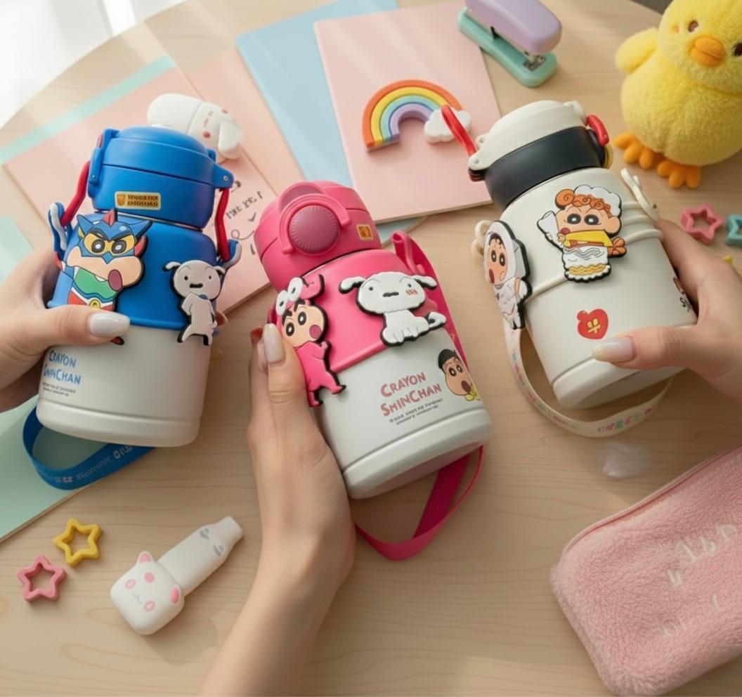 A: This insulated bottle combines long-lasting temperature control with a cute Shinchan-themed design kids adore. Durable, safe, and easy to carry, it’s the perfect everyday essential for school, travel, or outdoor fun — loved by little Shinchan fans who want both cool style and reliable hydration.