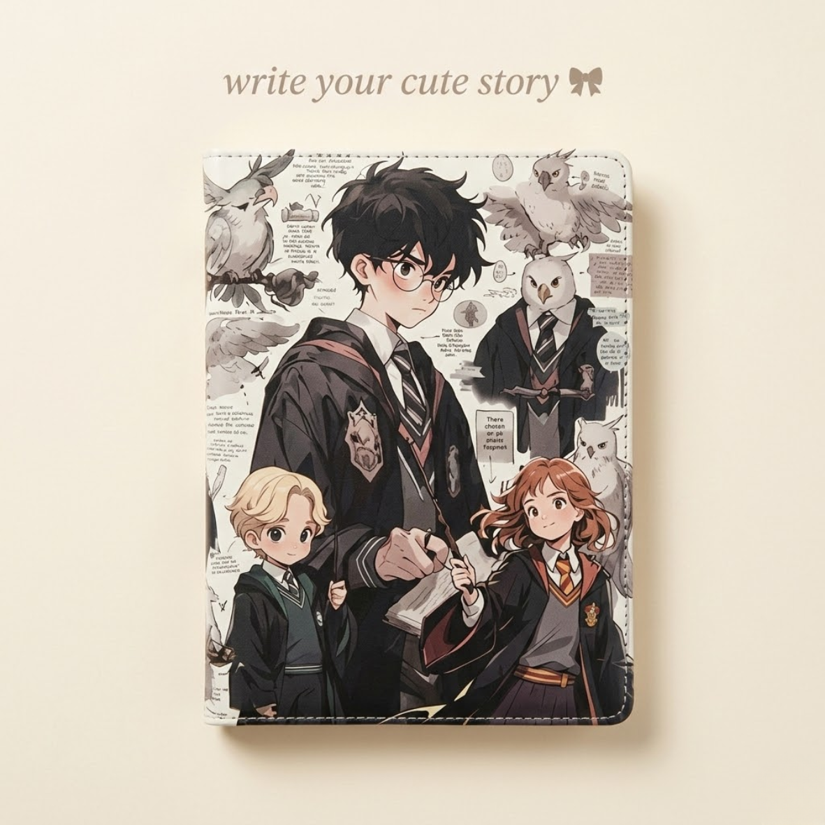 The design features high-quality, detailed anime-style illustrations of the main trio (Harry, Hermione, and possibly Ron or Draco) in their Hogwarts robes, surrounded by classic wizarding elements like Hedwig the owl, school notes, and scientific diagrams.