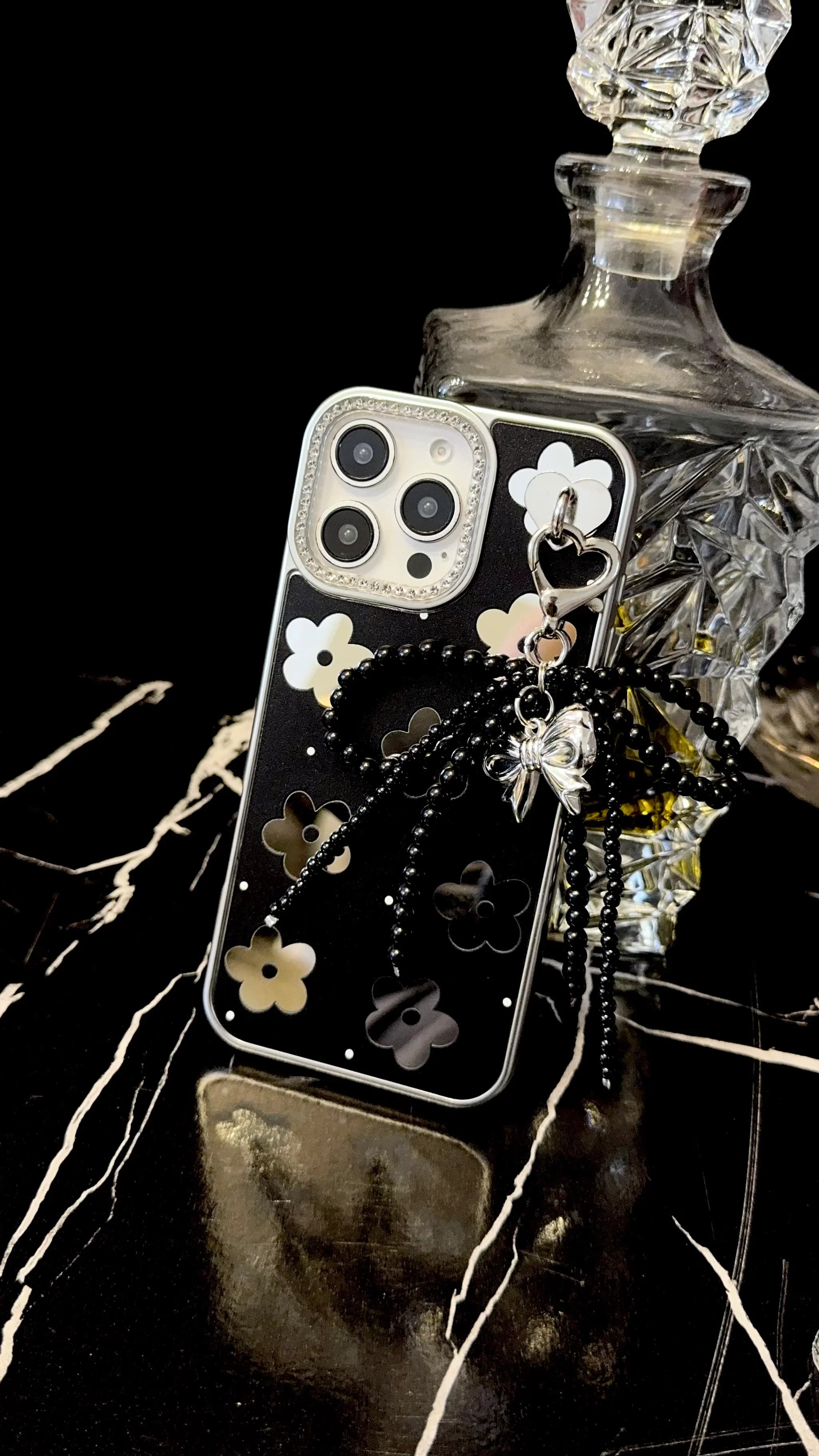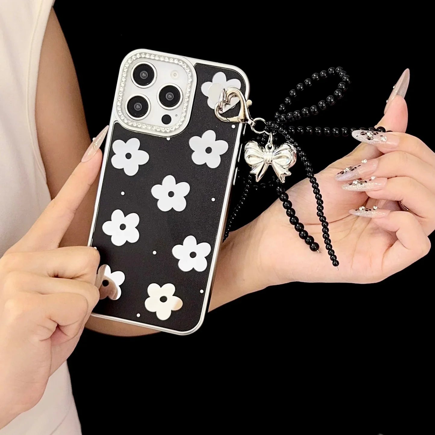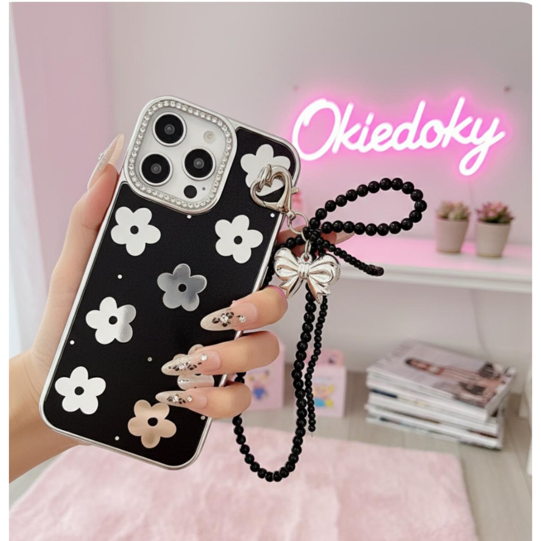 Turn your phone into a fashion accessory with this sophisticated black floral iPhone case. Designed with a glossy black background and contrasting metallic flower accents, it gives off a modern yet elegant vibe. The detachable silver bow charm, paired with black beaded details and a heart clasp, adds a luxe finishing touch that instantly enhances your look.