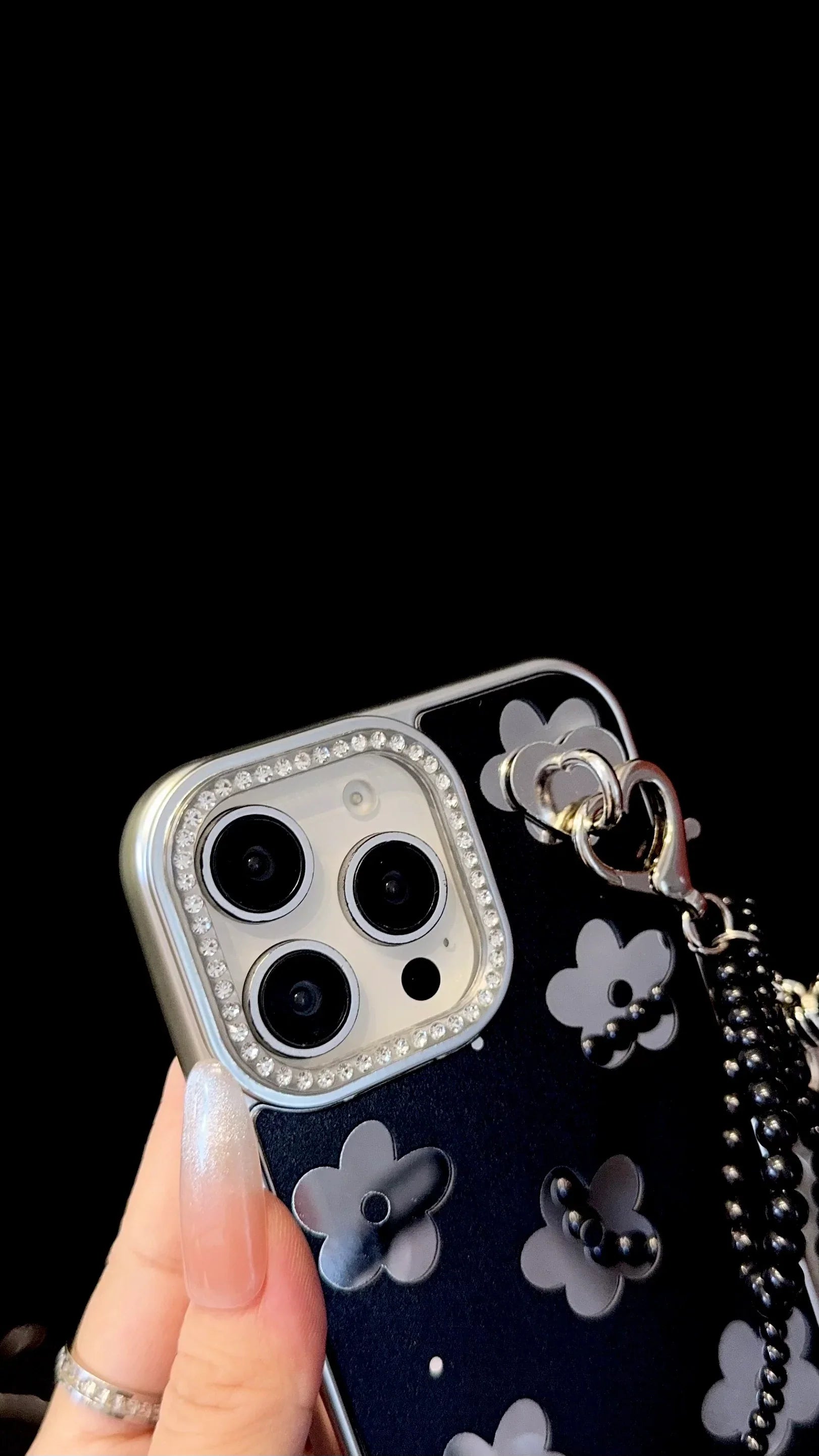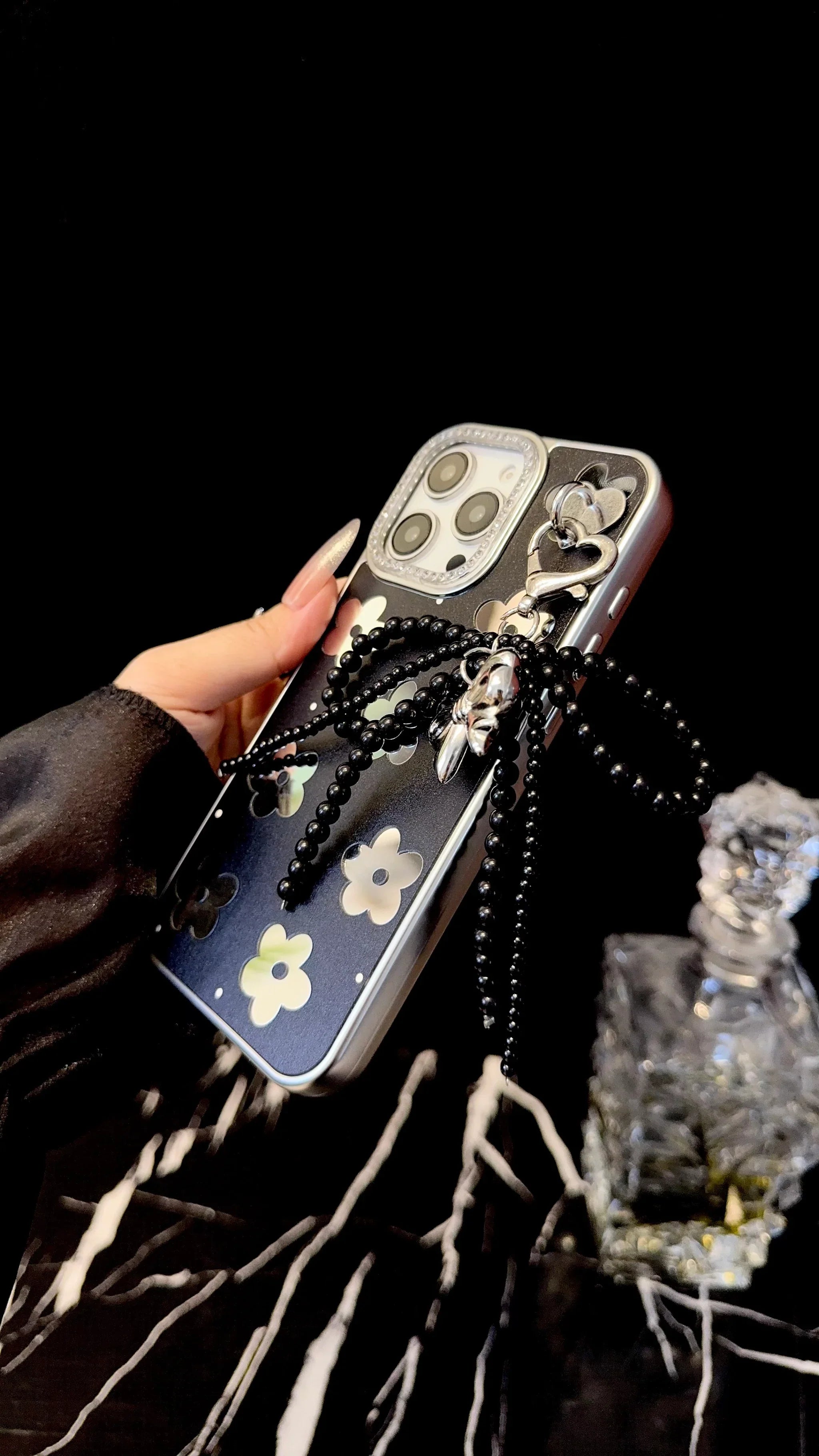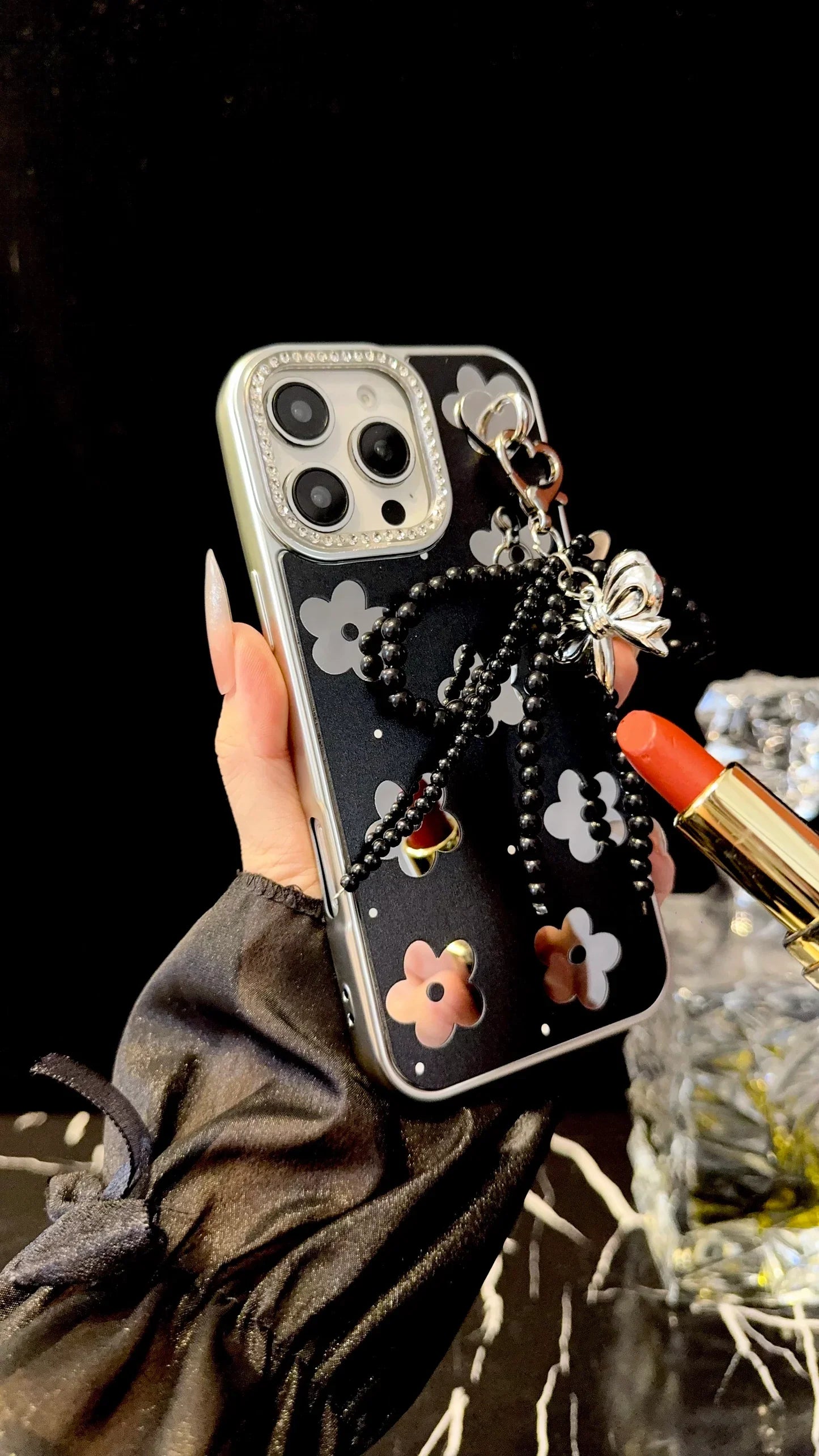 Turn your phone into a fashion accessory with this sophisticated black floral iPhone case. Designed with a glossy black background and contrasting metallic flower accents, it gives off a modern yet elegant vibe. The detachable silver bow charm, paired with black beaded details and a heart clasp, adds a luxe finishing touch that instantly enhances your look.