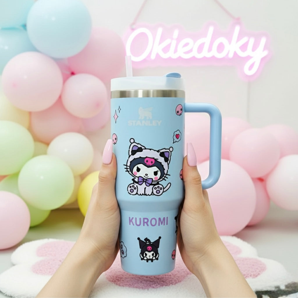 Stay hydrated the kawaii way with this adorable Kuromi-themed Stanley-style tumbler! Featuring your favorite mischievous Sanrio character in a pastel cat costume, this 1.18L (40oz) insulated tumbler is perfect for iced coffee, matcha, boba, or water on the go.