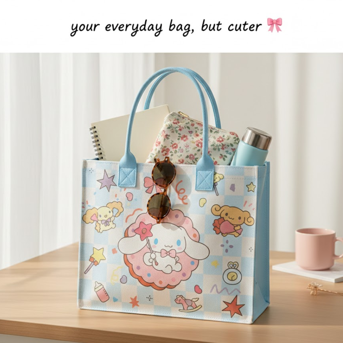 With its pastel tones and heartwarming design, the Cinnamoroll Tote Bag brings a smile to your day while keeping your essentials safe in style. โ๏ธ๐๐