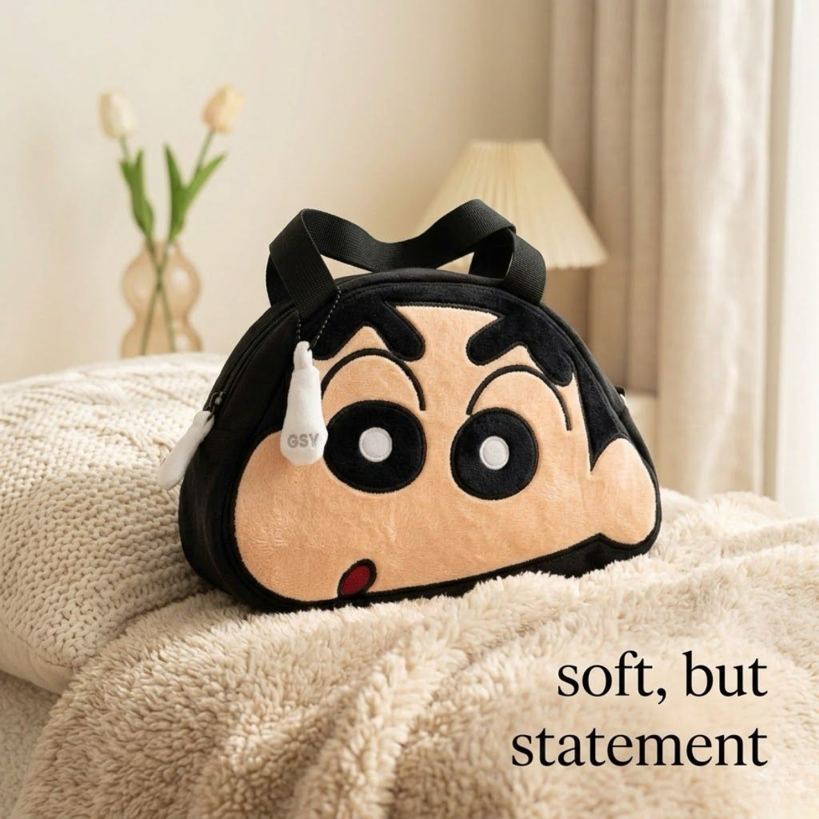 Add instant fun to your outfit with this Crayon Shin-chan Plush Sling Bag 🖤✨