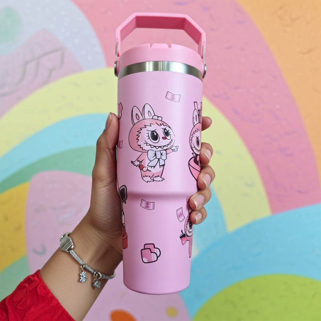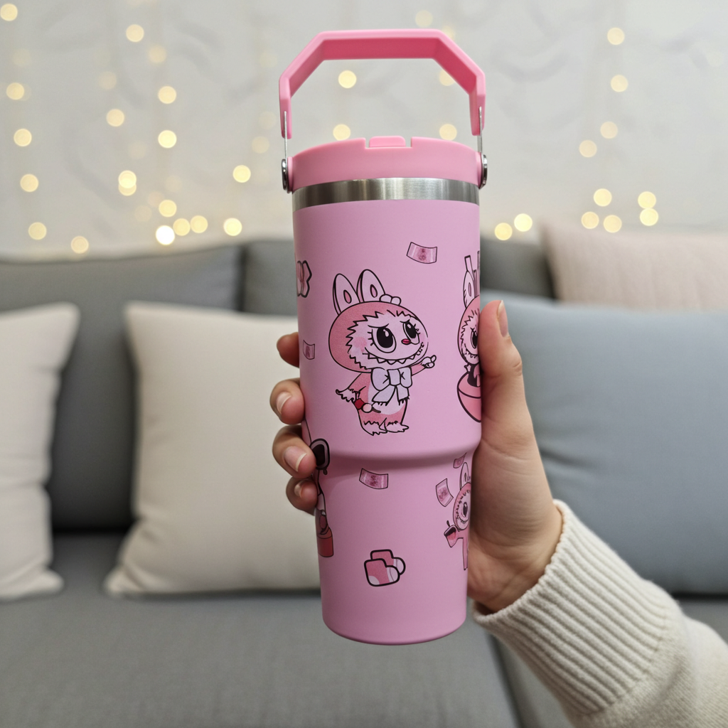 Carry your drinks in style with this Labubu pink tumbler featuring the iconic Labubu cartoon design. Made from durable stainless steel, this travel mug keeps your beverages hot or cold while adding a touch of cuteness to your day. The ergonomic handle makes it easy to carry on the go, whether for school, work, gym, or travel. With its fun and playful Labubu artwork, this tumbler is perfect for collectors, fans of The Monsters, and anyone who loves kawaii drinkware. A great gift idea for birthdays, holidays, or special occasions.