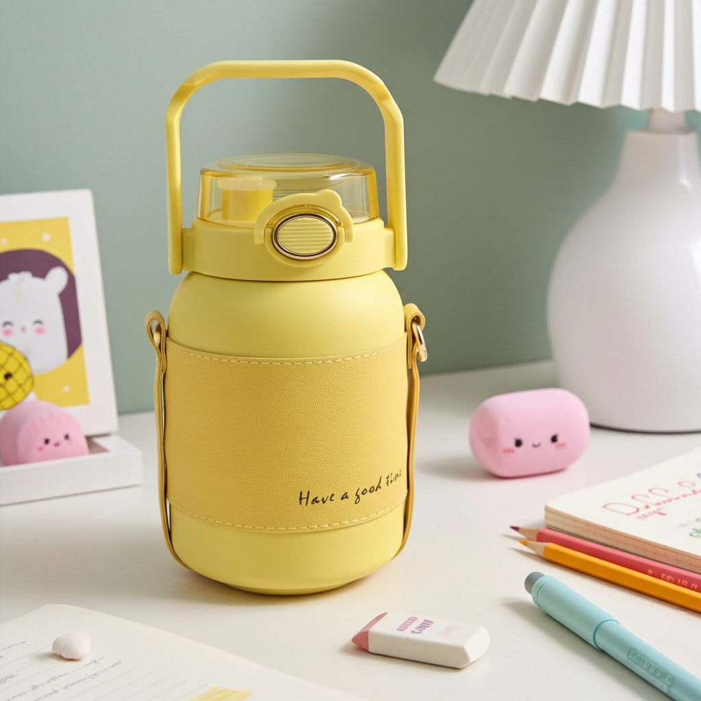 Cute Yellow Insulated Water Bottle with Handle & Strap