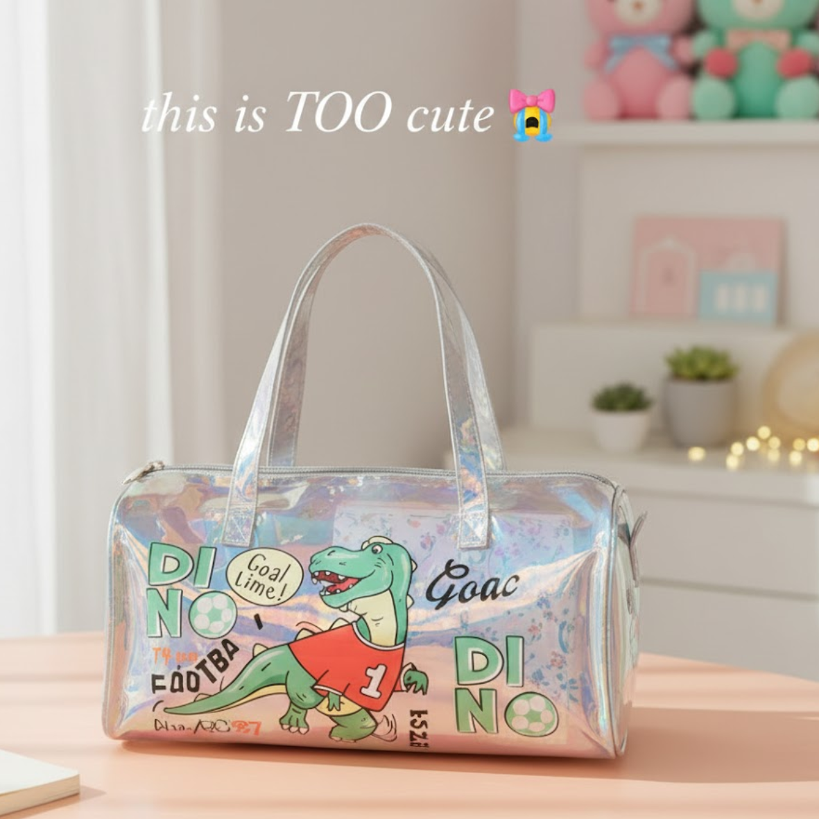 Get ready for adventure with this holographic dinosaur kids duffle bag! Featuring a playful sporty dino in a jersey with fun soccer-inspired details, this shiny bag is perfect for school, travel, sports, or overnight trips. Its holographic rainbow finish makes it extra eye-catching, while the spacious design gives kids plenty of room for clothes, books, or toys. Strong double handles ensure comfort and durability, making it a great everyday bag for active kids.