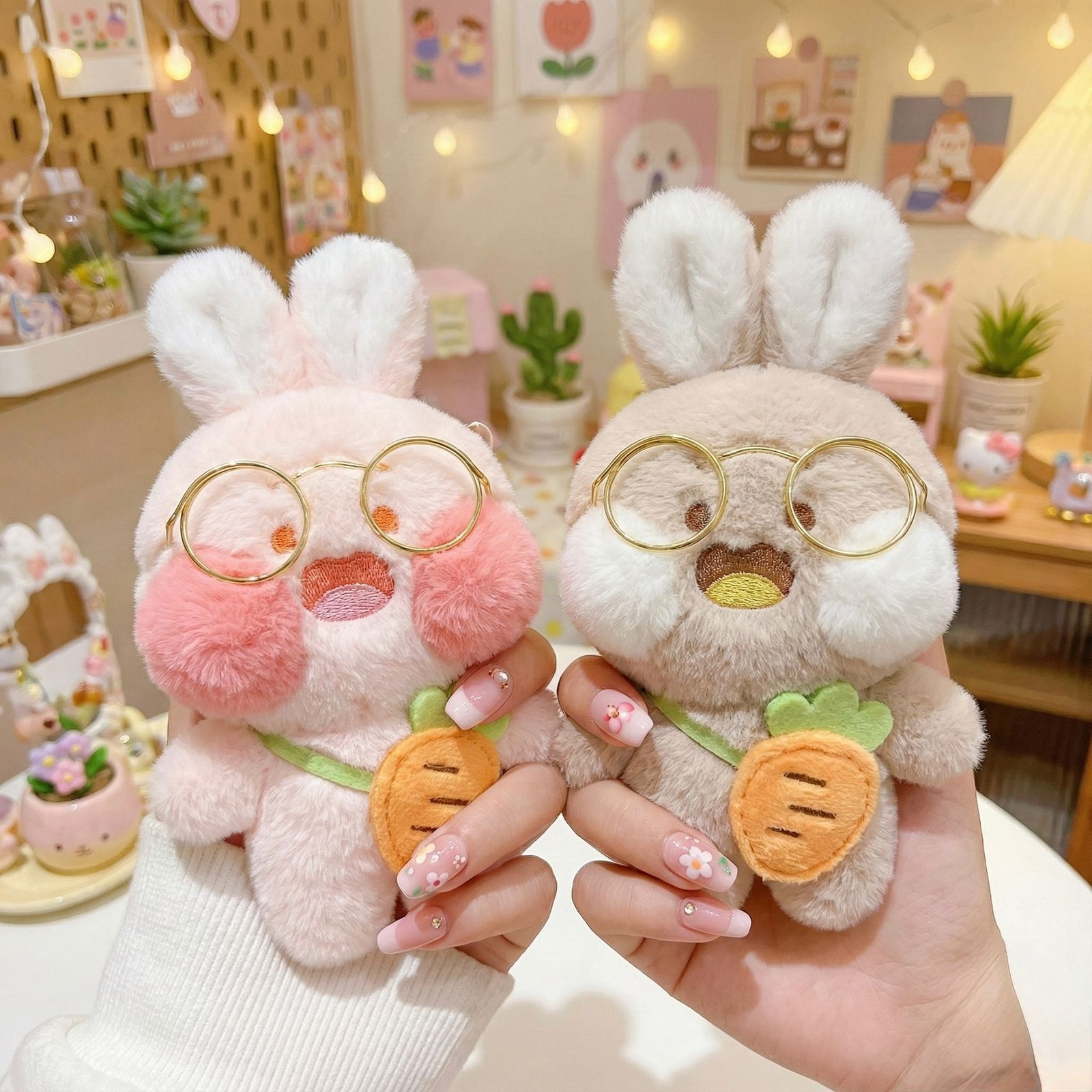 These delightful bunnies feature ultra-soft, dense plush fur in adorable shades like soft Pink or cozy Gray/Brown. Each bunny is uniquely styled with cute details: