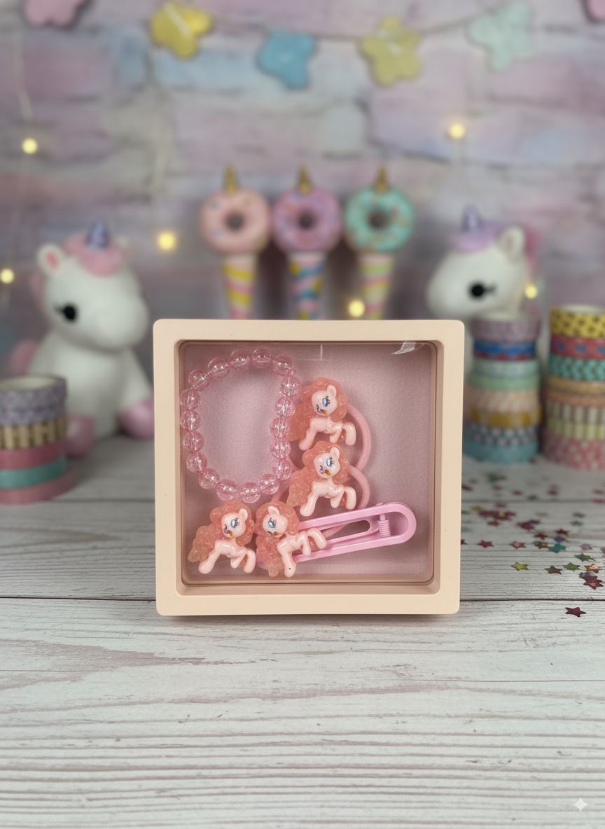 Kawaii Pink Pony Hair Accessories Set – Bracelet, Elastics & Clip