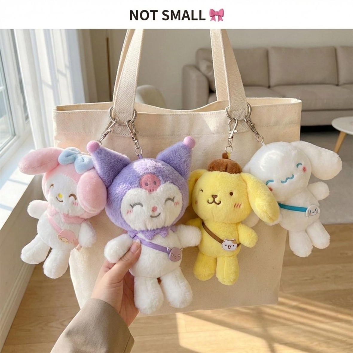 Featuring adorable characters like Hello Kitty, Kuromi, My Melody, and Cinnamoroll, these oversized plush charms come with a cute mini sling strap design β making them stand out from regular bag charms.