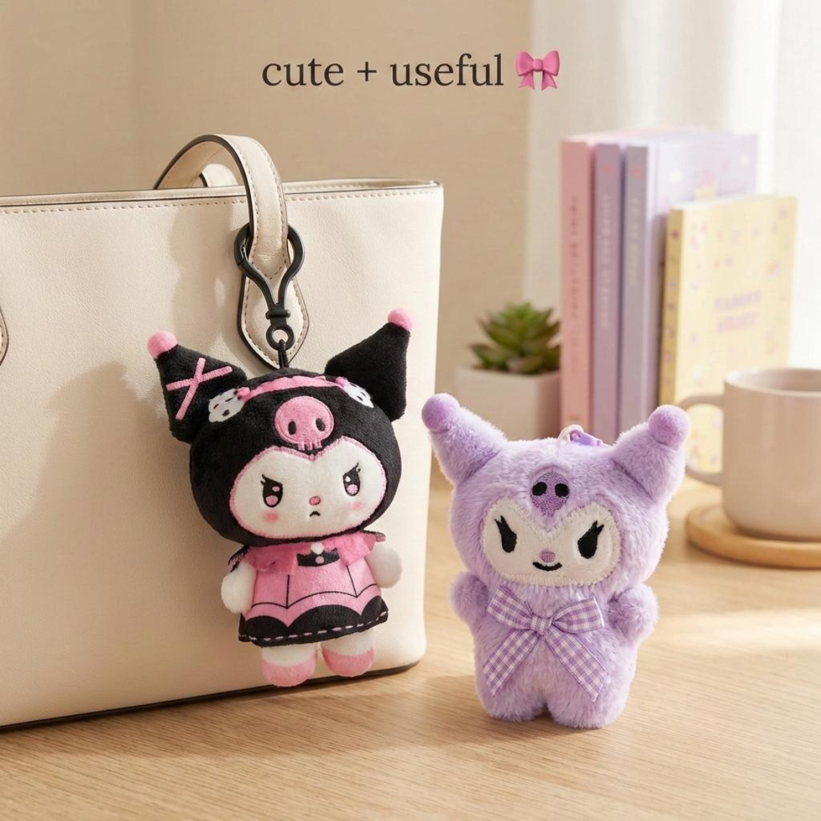 This adorable combo includes 1 soft Kuromi squishy and 1 fluffy Kuromi plush bag charm, perfect for Sanrio lovers and kawaii collectors.