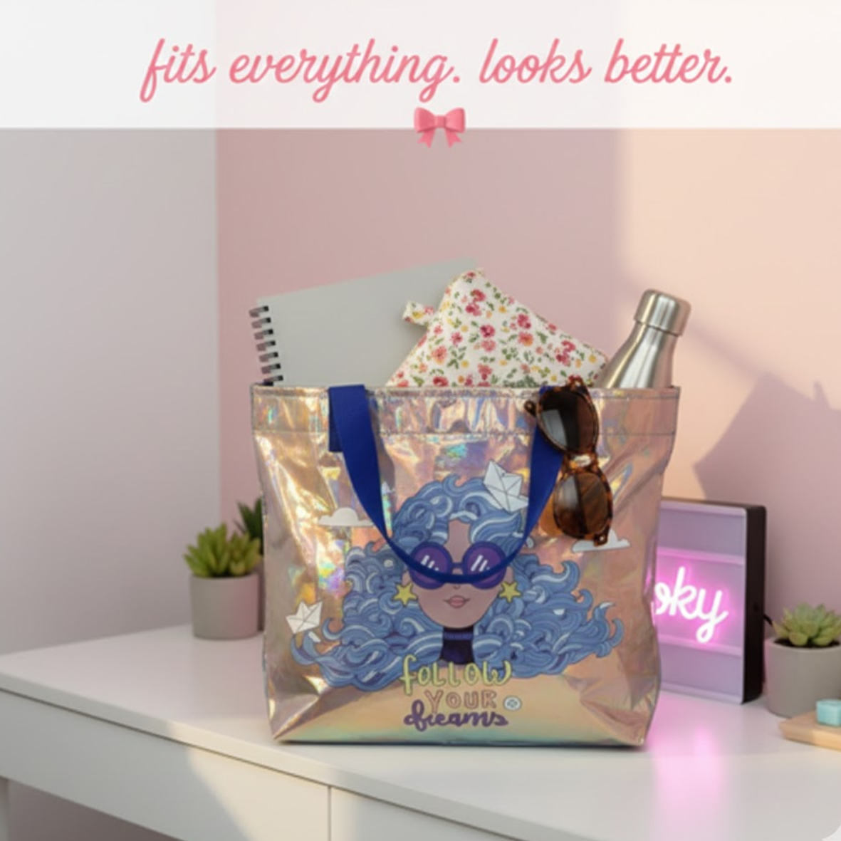 Large Holographic Tote Bag with “Follow Your Dreams” Design