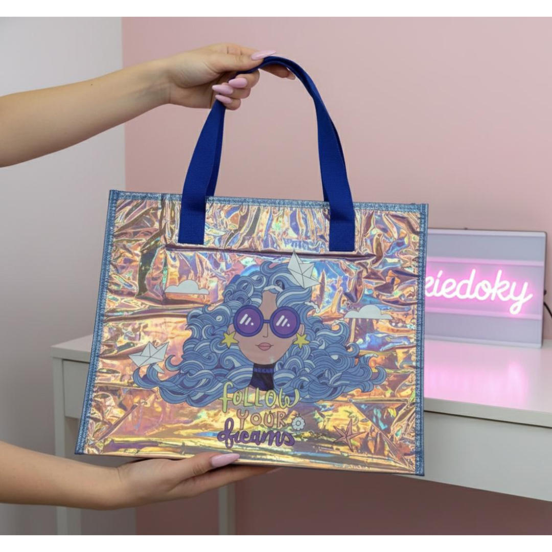 Shine bright and stay inspired with this Large Holographic Tote Bag, featuring a bold “Follow Your Dreams” design and an artistic illustration of a girl with flowing blue hair and paper boats. The iridescent holographic finish changes colors beautifully under different lighting, making it a perfect statement accessory for any outfit.