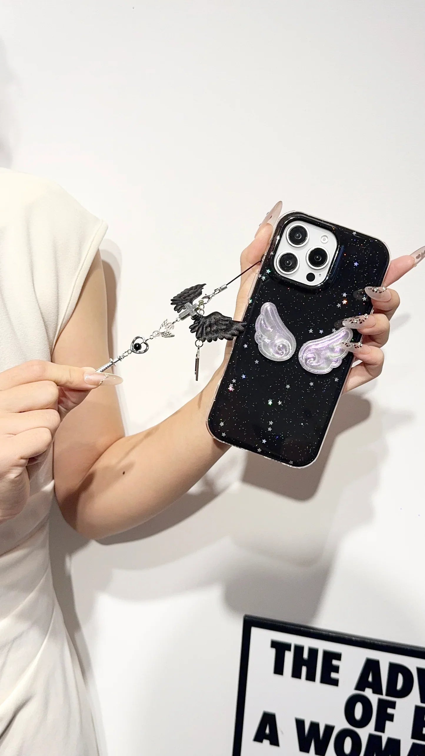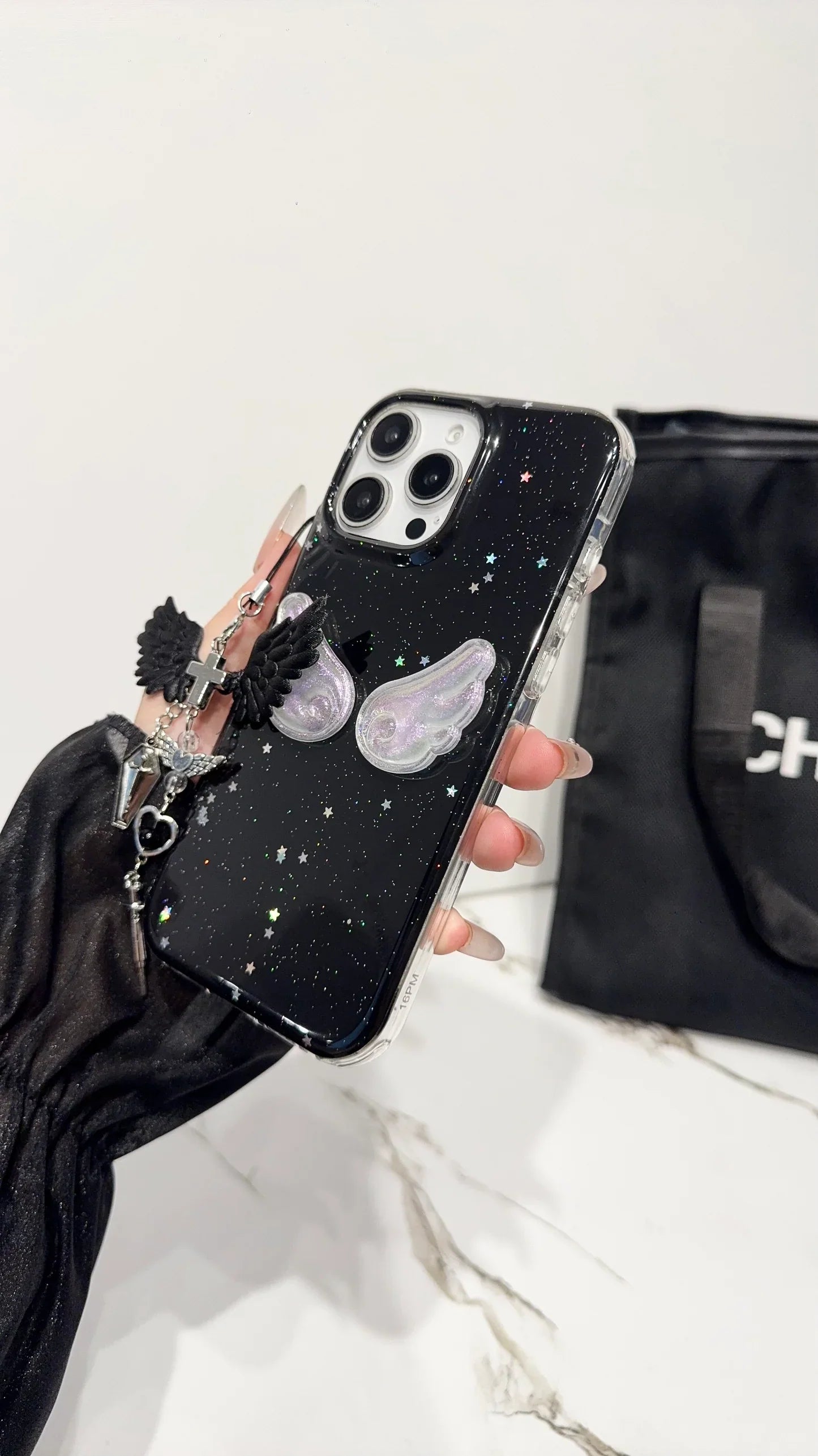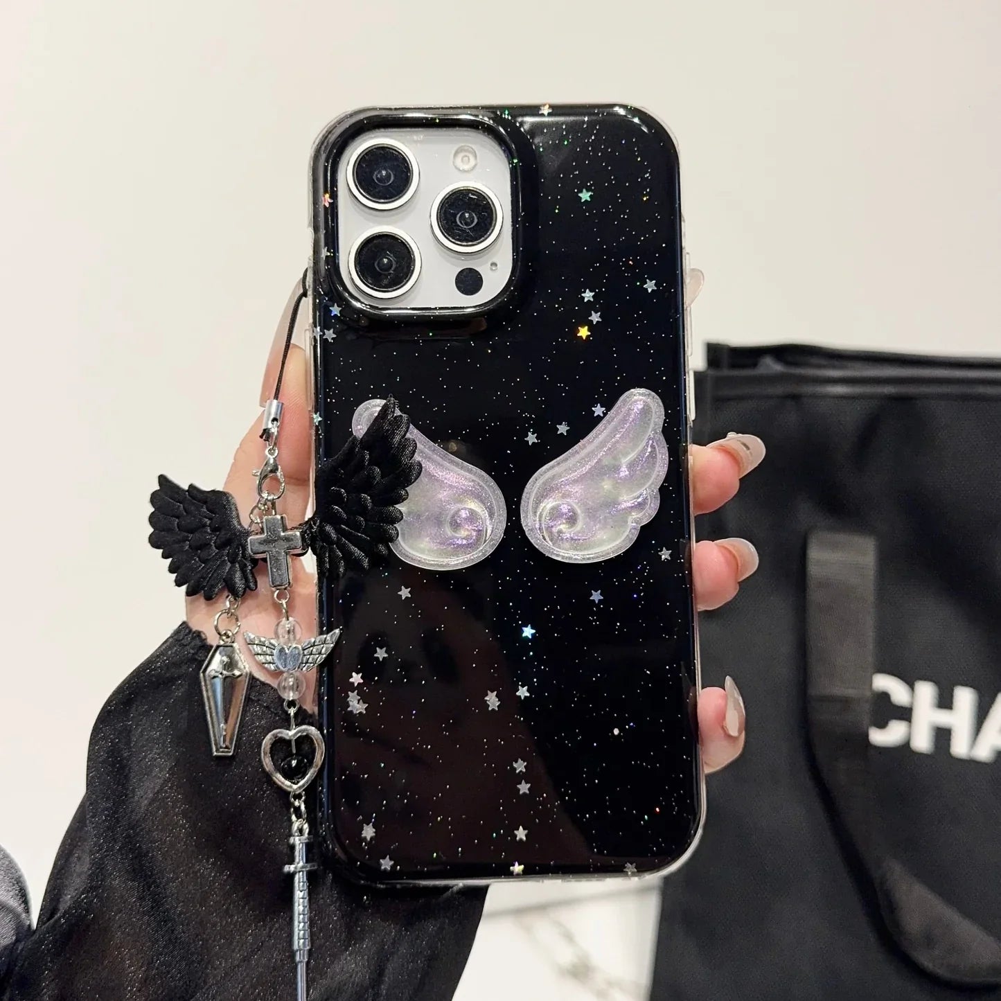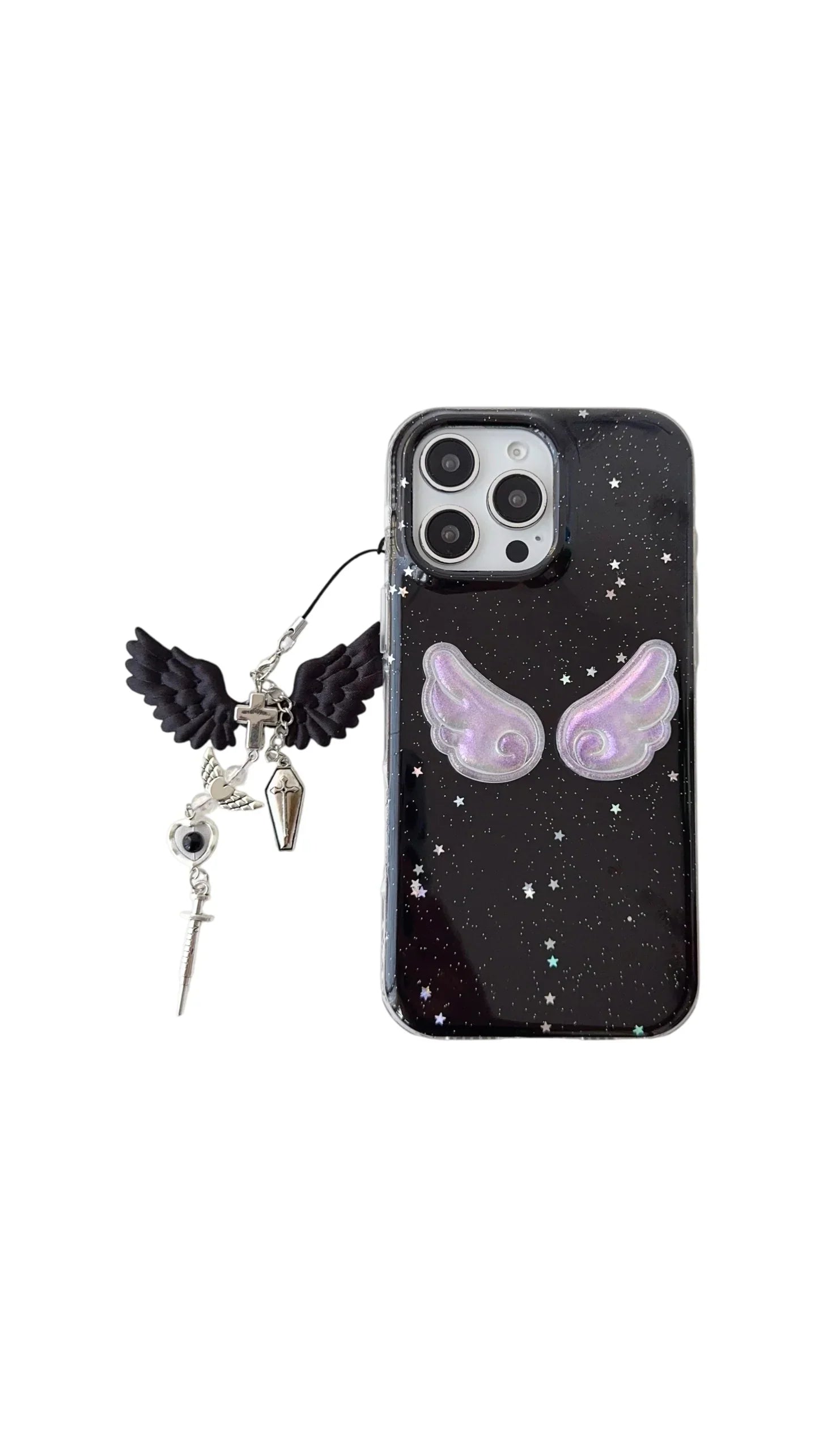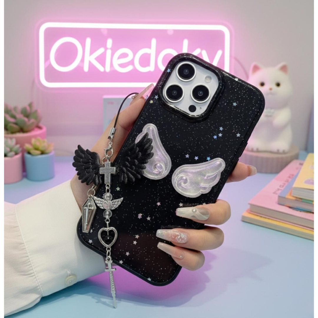 Make a bold statement with this Midnight Angel Wings iPhone case — where celestial meets gothic. The deep black base, speckled with glittering star-like details, creates a dreamy galaxy effect, while the iridescent 3D angel wings add a soft, ethereal glow. The attached charm combines black wings, metallic crosses, and crystal accents, giving it a mysterious and stylish look that stands out effortlessly.