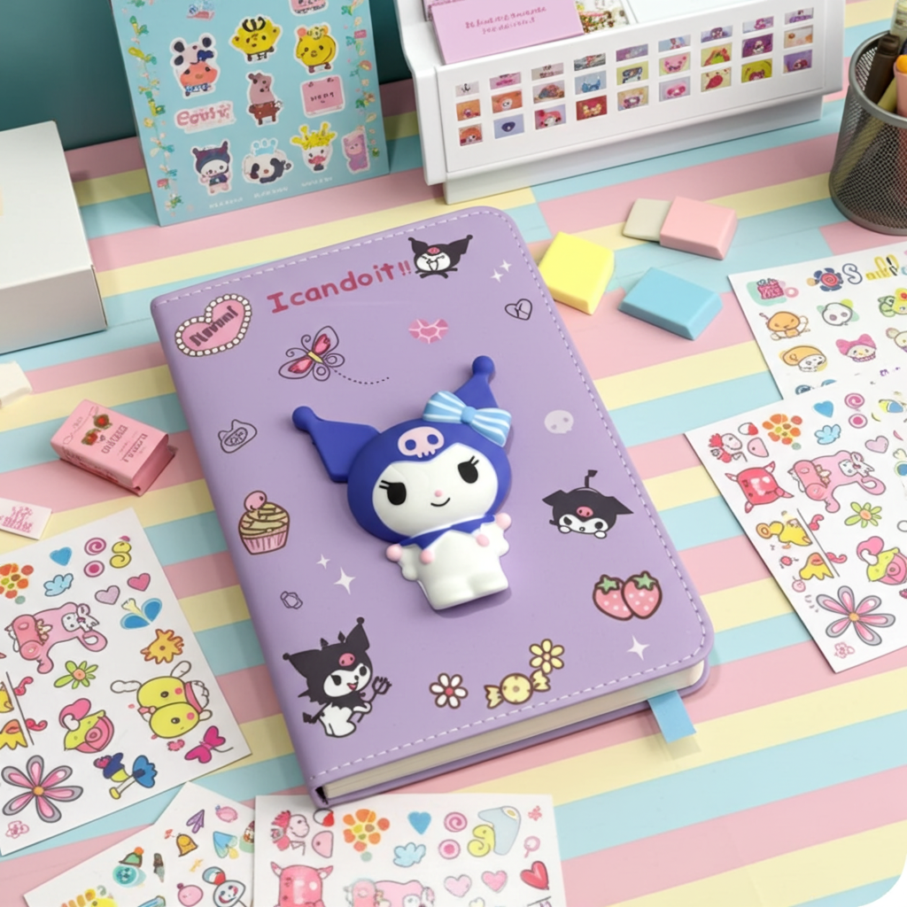 Brighten your desk and inspire your creativity with this adorable purple Kuromi 3D notebook! The cover features playful Kuromi and Sanrio-themed illustrations, sweet strawberries, cupcakes, and cheerful designs alongside the uplifting quote "I can do it!!". The highlight is the 3D Kuromi figure with a blue bow, adding a fun and tactile touch to your stationery. Perfect for journaling, note-taking, planning, or as a collectible gift, this kawaii notebook combines cute Japanese aesthetics with motivation and charm. Ideal for Sanrio lovers, students, artists, and anyone who enjoys pastel stationery that sparks joy.